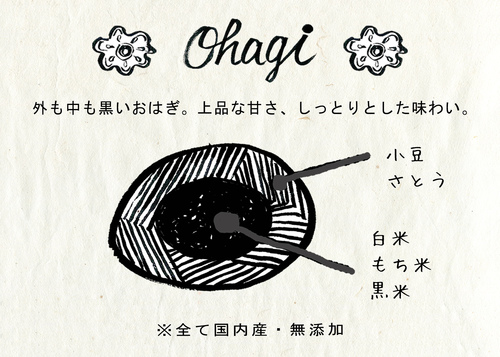 従来のおはぎと違い、外見も中身も真っ黒なおはぎです。上品な甘さと、しっとりとした味わいがくせになるとご好評をいただいております。