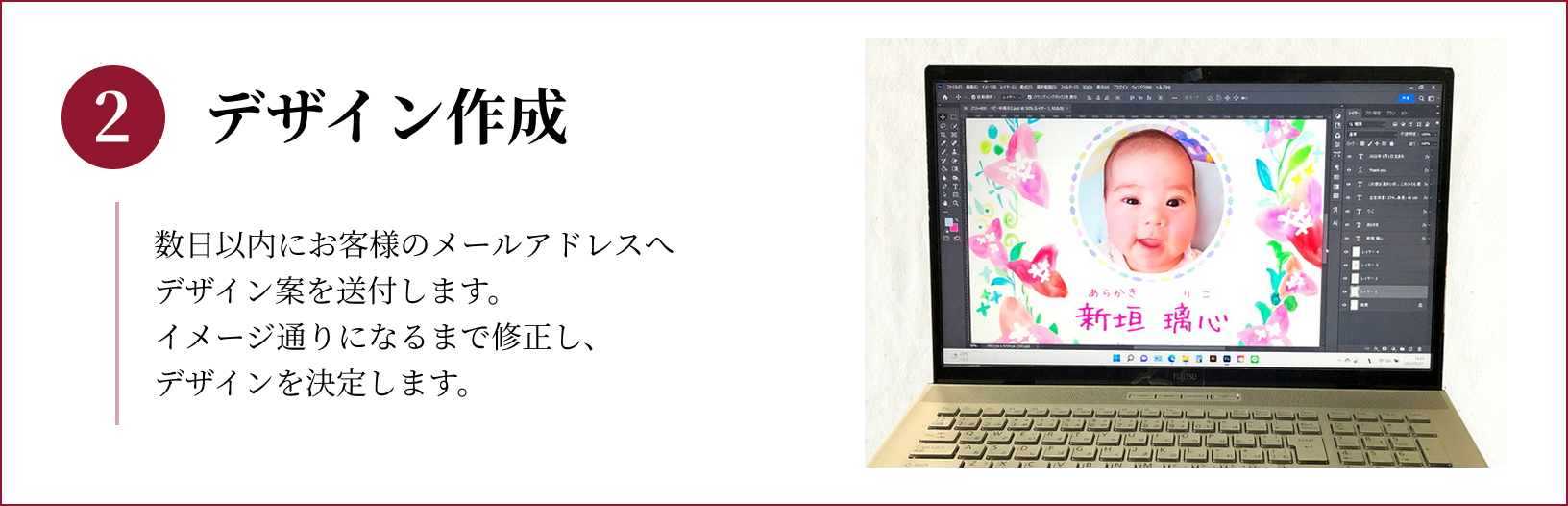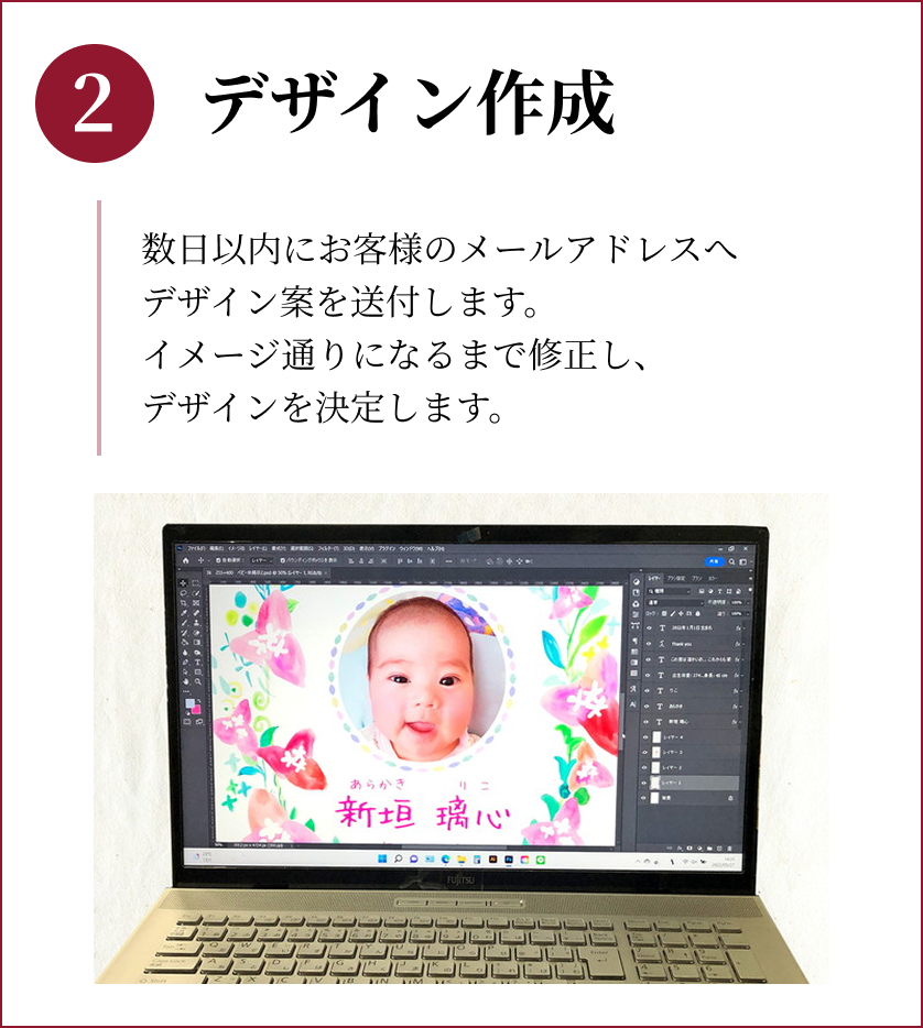 赤ちゃんの写真と家族写真を並べて載せることもできます。全フレーム対応可能です。